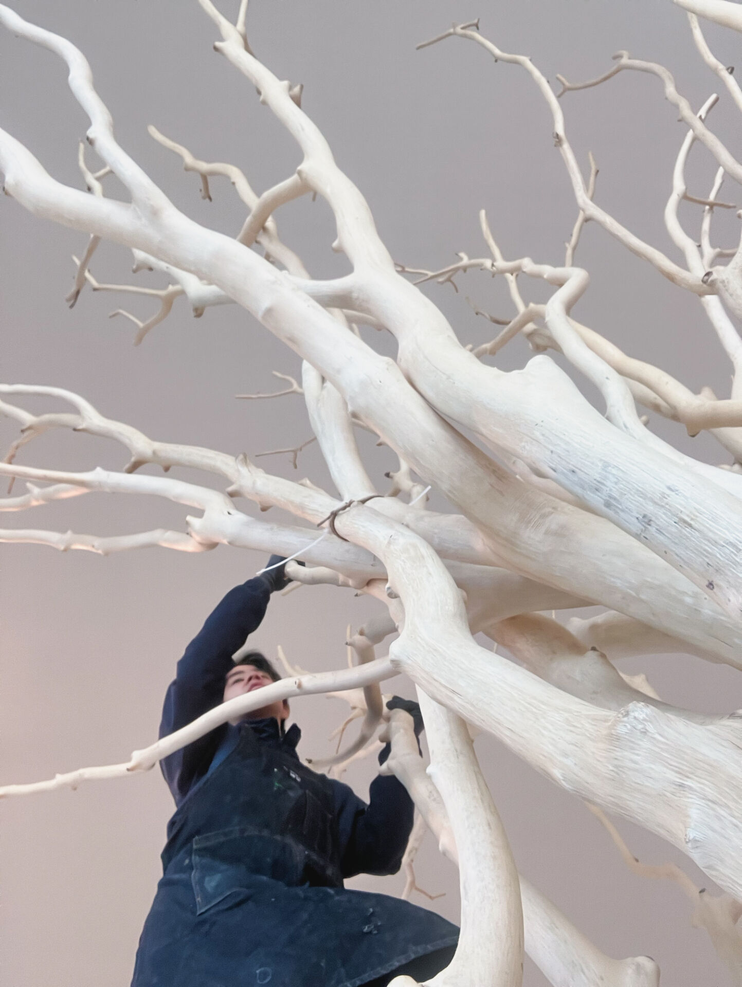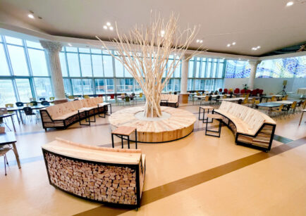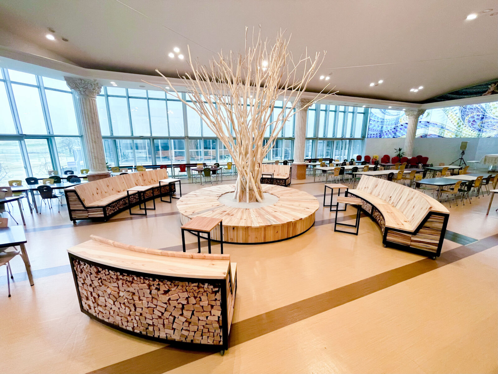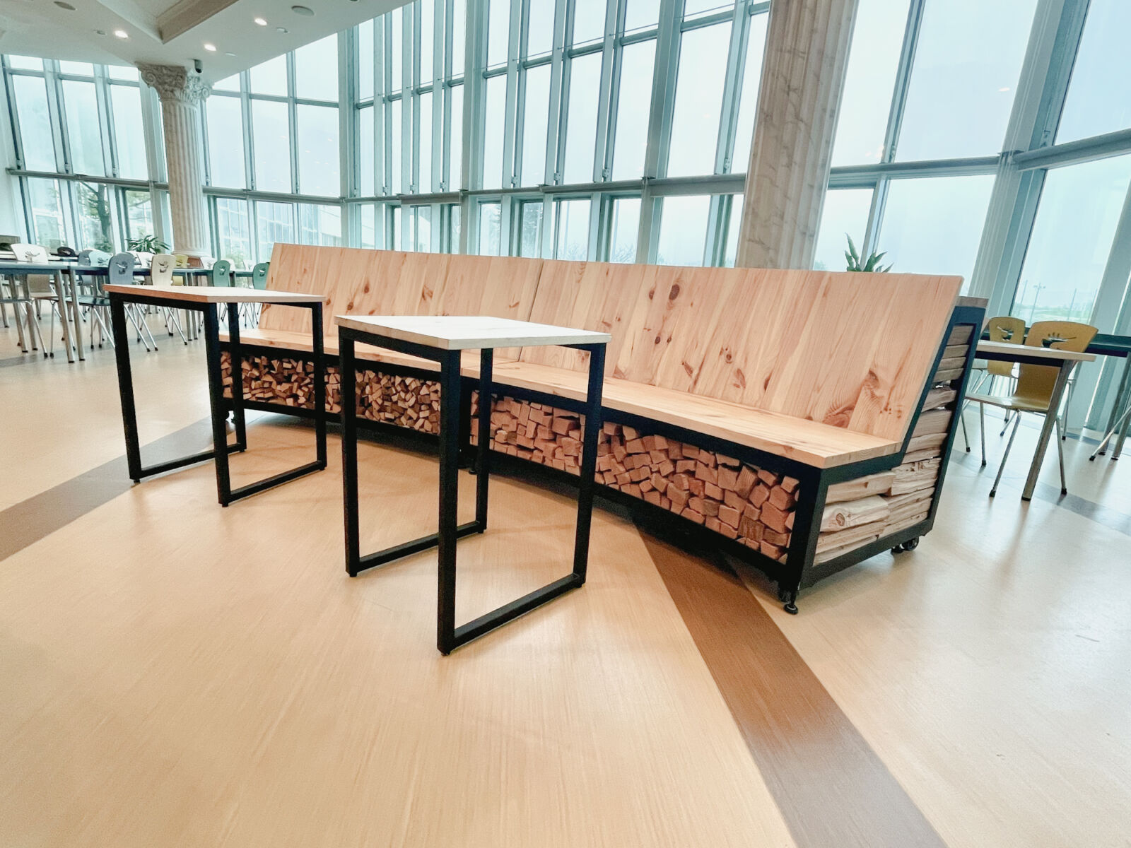 江戸川学園取手中・高等学校「シンボルツリー」所在地茨城県取手市実施年月 2024/ 3 プロジェクトインテリア公共・学校公共施設概要シンボルツリー・薪ベンチ設置ベンチシンボルツリーSTORY誰かに自慢したくなるようなコミュニティホールを! 生徒たちでにぎわう白亜の宮殿のようなホールの真ん中に、クリーム色でかわいい天然木のシンボルツリーができました。 枝ぶりの良いエンジュの木を山から伐り出し、皮を剥き磨いて、バランスを整えながら組み立てます。 それを囲むように、色とりどり様々な樹種の薪がつまったベンチと、個性的な木目の表情を持つテーブル。 素敵な思い出がいっぱいの学園ライフを!
